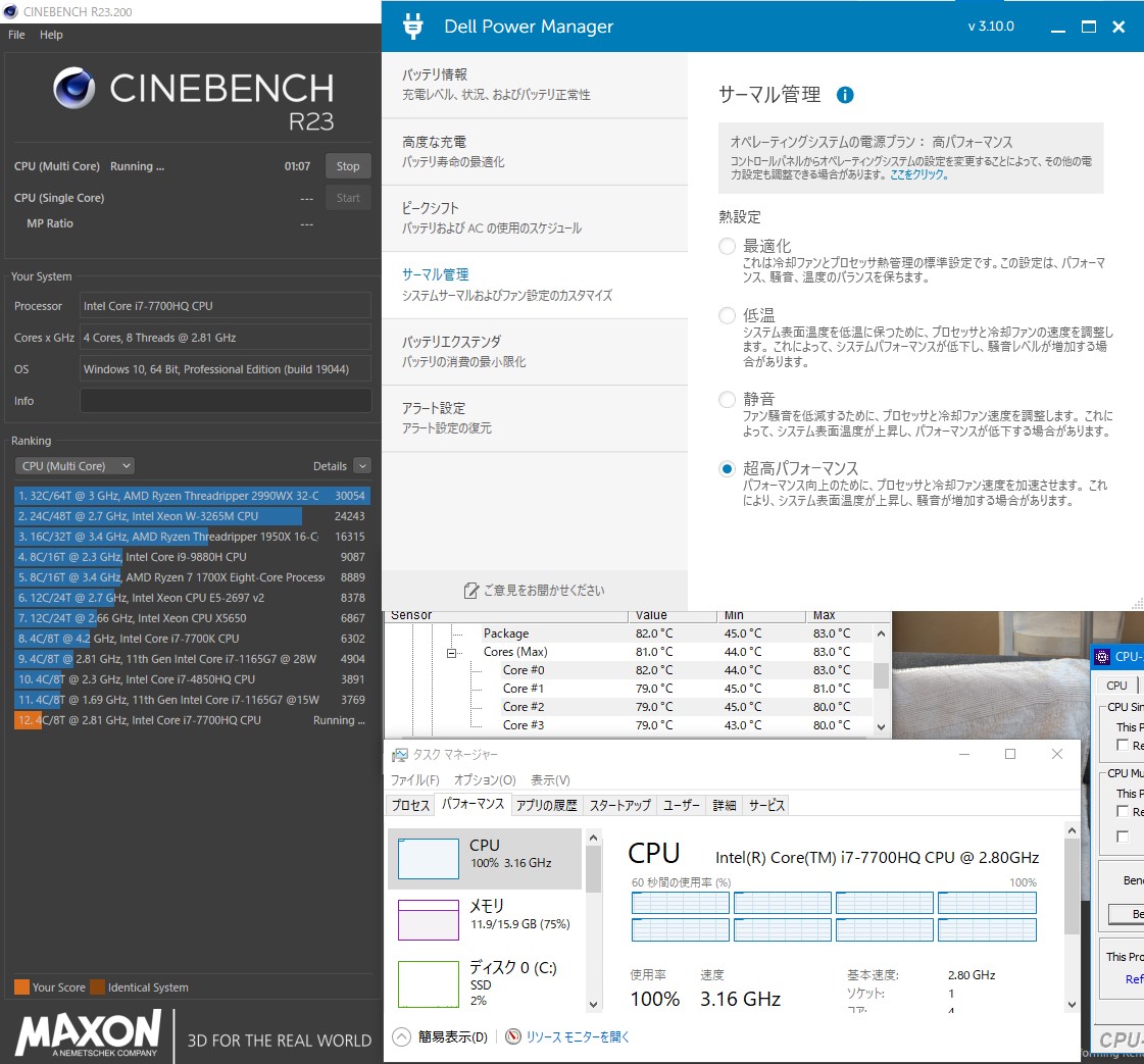 負荷が無いと全く分からないので、ベンチマークソフトを使ってCPU温度を上げてみます。冷静に考えてみれば、動画のエンコードすればよかっただけなんですけど・・・。それはさておき、80度を超えたところでファンがうるさくなって、55度くらいで静かになりました。なんか設定は効いてるっぽいですね。「Dell Power Manager」が未だに理解できないので、ベンチマーク中に「サーマル管理」を変更してみたところ・・・