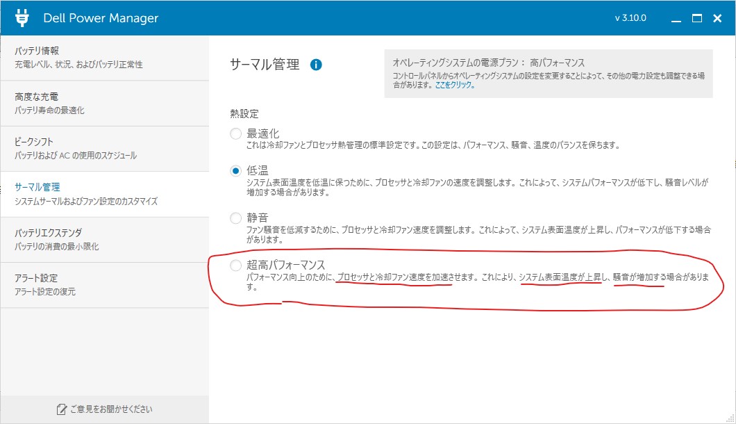すぐにでもファンを最速で回したいので「超高パフォーマンス」を選択したのですが、説明文が回りくどいというか、どっちなんじゃい?と言いたくなります。「CPUもファンも最速でぶん回します」って書いてくれればいいんだけど・・・コレそーゆー意味ですよね?