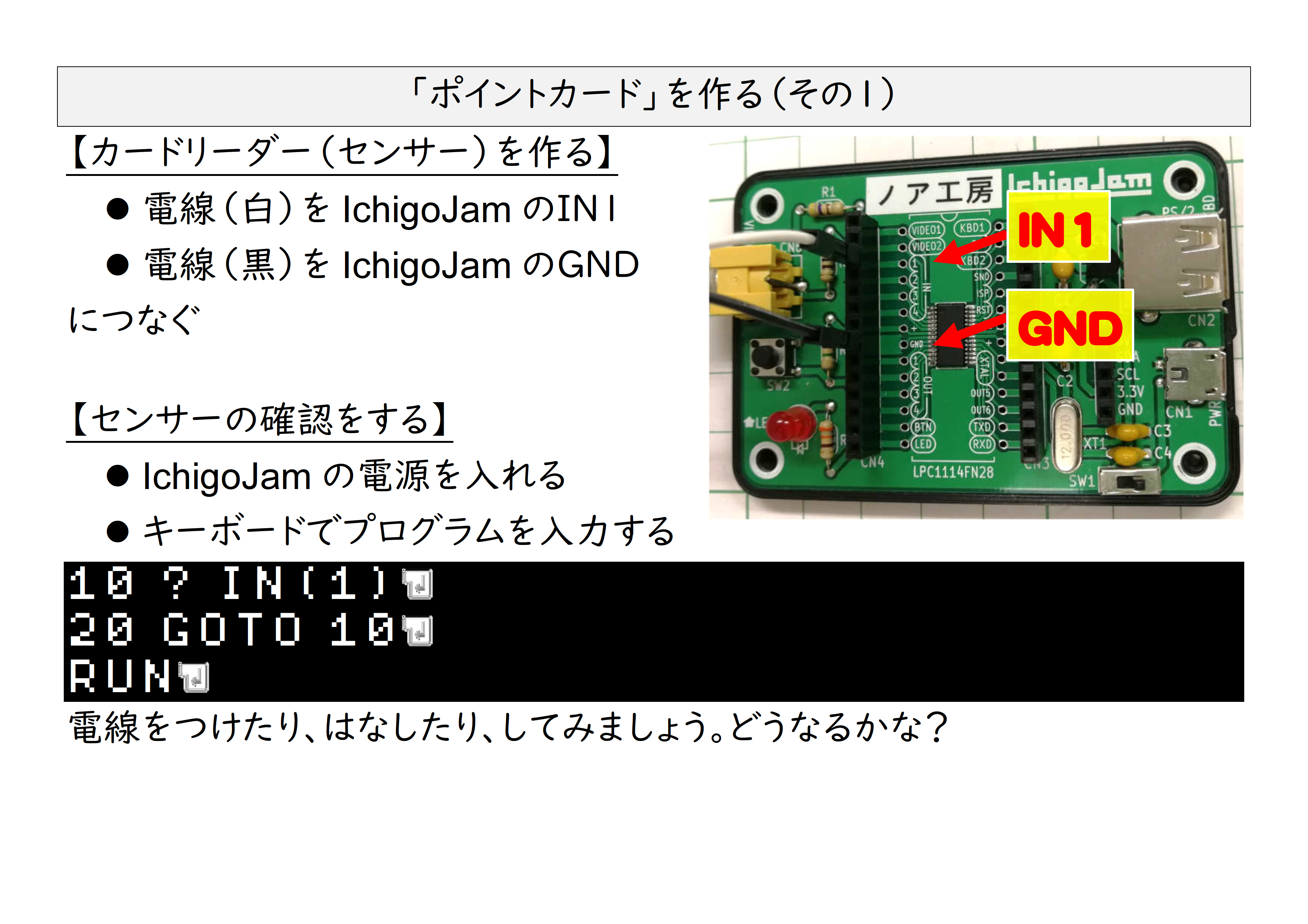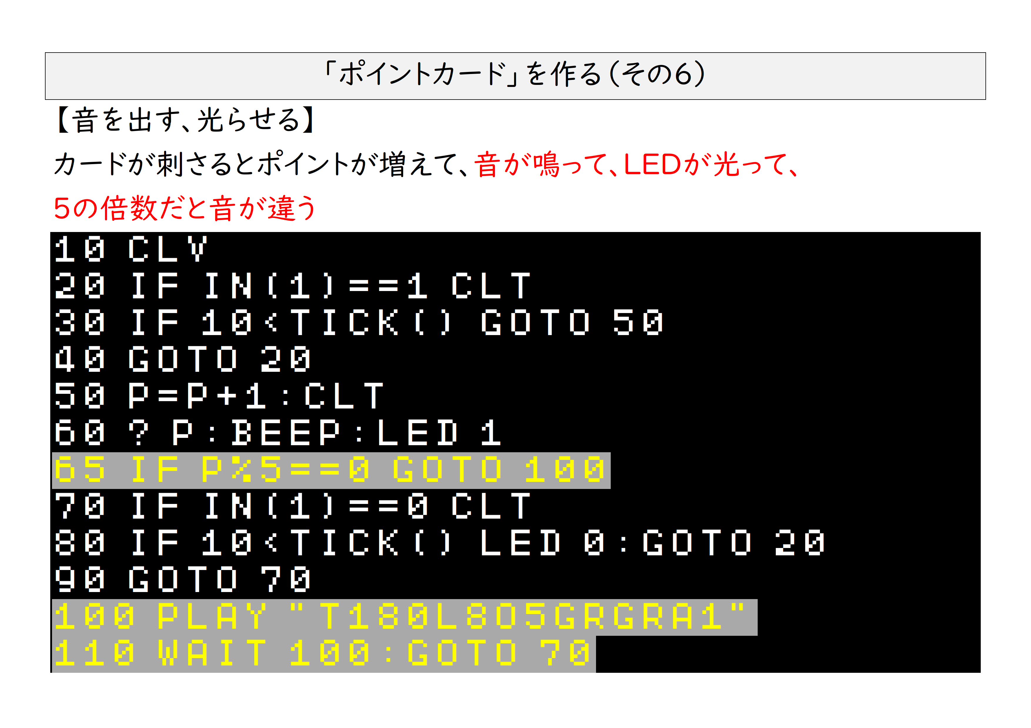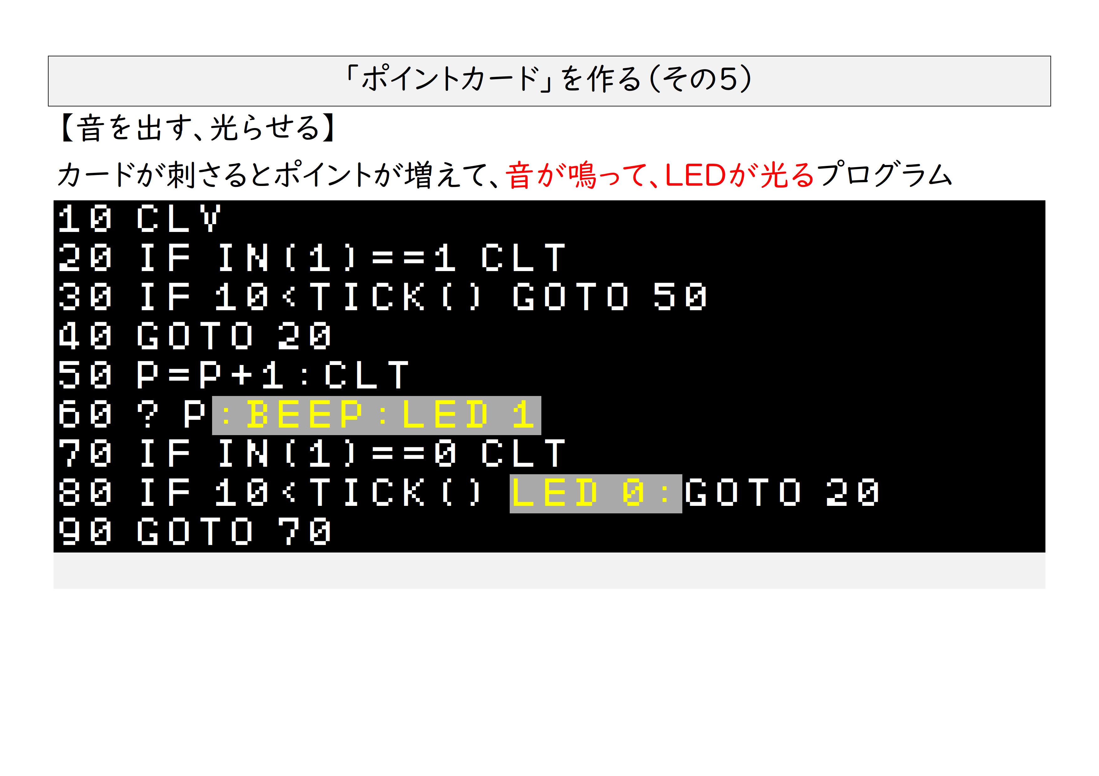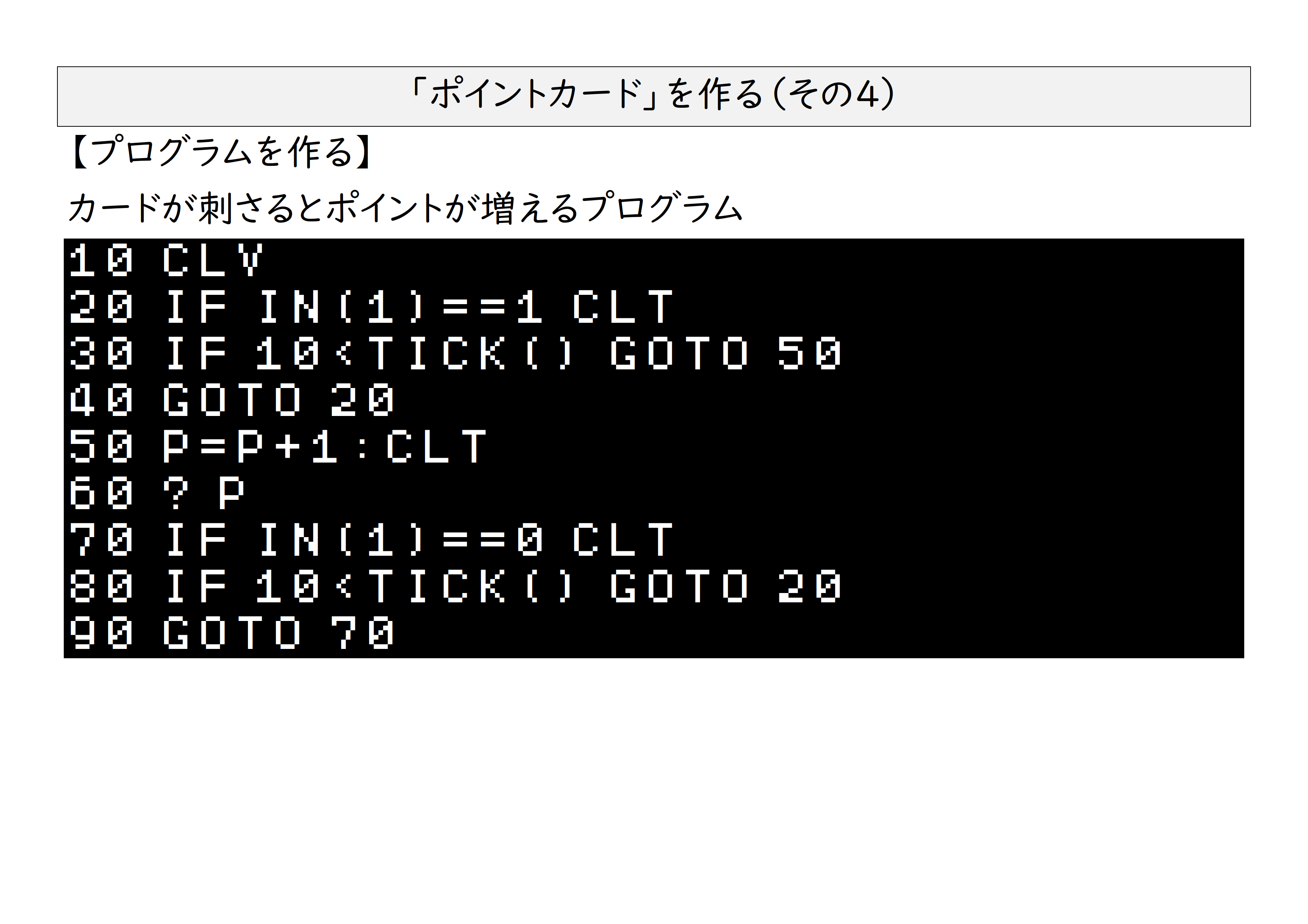 その中で、工作のコツ、工作のヒントをお伝えしてきましたが・・・伝わっていればいいんですけど~。できるだけ簡単にするために、コンピューターに2本の電線と厚紙、段ボール、アルミホイル。これだけでポイントカードシステムが完成します。プログラムはこんな感じです。似たようなプログラムが複数ある理由や、工作に関しては最後に動画を入れてますので、そちらをご覧ください。(ちょっと長いんですけどね・・・)