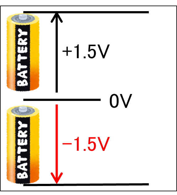 では、2本の電池の真ん中を基準にして電圧を考えるとどうでしょう?電池の電圧は変わりませんが、下にある電池の電圧はマイナスになります。